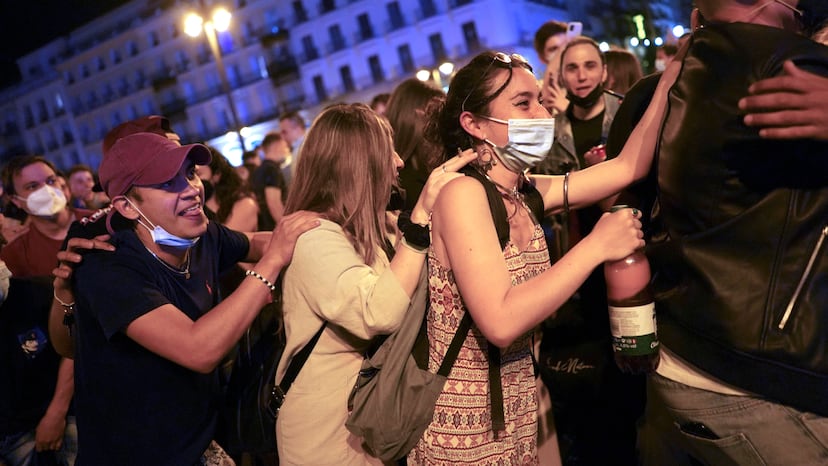 El final de las restricciones en la capital española tuvo la Puerta del Sol como uno de sus escenarios. Es la plaza más emblemática de la noche del 31 de diciembre. En esta ocasión, en lugar de uvas, hubo latas de cerveza. Varios cientos de personas se congregaron allí para festejar por todo lo alto el entierro del toque de queda aunque Madrid siga bajo la pesada losa de una incidencia acumulada de 317 casos por cada 100.000 habitantes en los últimos 14 días. Eso supone alto riesgo.