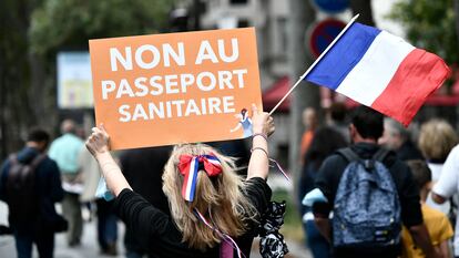 Decenas de miles de franceses volvieron a salir este sábado a las calles, por cuarta semana consecutiva, para protestar contra el certificado covid y la imposición de una vacunación obligatoria a sectores profesionales como los sanitarios. A 48 horas de la implementación del certificado en todo el país a partir del lunes, después de que el Consejo Constitucional lo validara el jueves, las manifestaciones se convirtieron también en un nuevo —que no último— grito de frustración contra lo que muchos de los participantes consideran una “vacunación obligatoria” maquillada y una restricción de libertades de tintes “dictatoriales”. Según el Ministerio del Interior, al menos 237.000 personas se manifestaron en las más de 150 convocatorias en toda Francia, 17.000 de ellas en París. La cifra confirma la participación al alza en estas protestas que comenzaron hace un mes: la semana pasada, fueron 204.000.