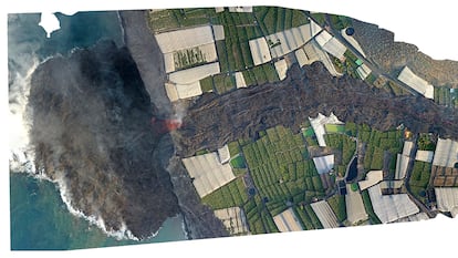 Mientras, la erupción sigue aumentando la superficie de la isla. “La colada que ha alcanzado al mar mantiene un caudal continuo fuerte en forma de cascada”, ha explicado Blanco. Así, la desembocadura de la lava en lo que solía ser la playa del Guirre se extiende ya hasta las 17,2 hectáreas, con lo que ha crecido tres veces respecto a los datos oficiales del mediodía del martes. Es una superficie tan grande como para poner encima ocho veces la Mezquita de Córdoba (2,3 hectáreas). La profundidad de la lava vertida al mar alcanza ya los 24 metros, según los datos del Plan Especial de Protección Civil y Atención de Emergencias por riesgo volcánico en Canarias (Pevolca). El resto de coladas están prácticamente inactivas.