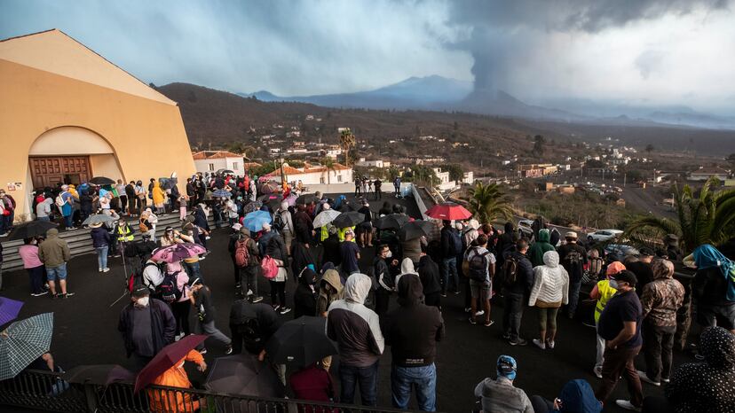 El sábado no era un día propicio para observar el volcán de La Palma. Llovía ceniza como si fuera agua, lo que ennegrece el cielo y empeora la visión. Sin embargo, el mirador en la iglesia de Tajuya (El Paso) estaba repleto de personas observando la erupción. Es el punto desde el que mejor se vislumbra el volcán, donde acuden casi todos los turistas que este fin de semana, puente de Todos los Santos, llenan la isla. Hay tal nivel de ocupación hotelera que el Cabildo de La Palma ha habilitado ocho autobuses que parten cada media hora desde el aeropuerto viejo de Buenavista, cerca de Santa Cruz, la capital —alejada de la nube de ceniza—, y que dejan a los turistas junto a la iglesia.