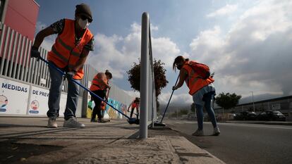 “Esto es muy duro. No es un trabajo de limpieza normal, en el que vas cambiando un poco de posición. Es todo el rato el mismo movimiento con el cepillo y se te agarrotan los músculos. Y la ceniza pesa más que la basura”, añade Milagros Armas, de 44 años. A su lado, Rodríguez se seca la frente con la mano. Lleva una mascarilla FPP2. Cuando se la baja ligeramente se descubre una línea negra en su cara, como si estuviera dibujada a lápiz. Junto a ellas hay otras cinco mujeres armadas con cepillos, operarias de limpieza que despejan la entrada de un colegio. Todas llevan gafas o pantallas protectoras. “Haces lo posible por no rascarte los ojos, pero no se puede evitar. Tienes que echarte colirio cada dos por tres”, asegura Armas.
