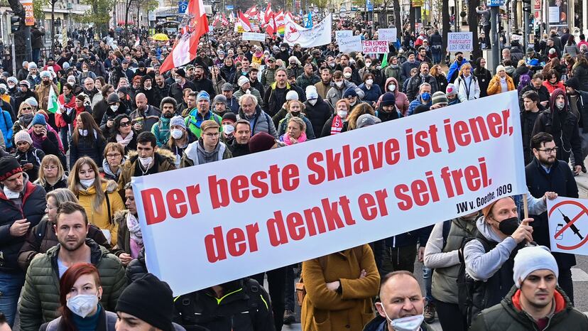 Las autoridades estiman que entre 35.000 y 40.000 personas han participado en la protesta, salpicada por eslóganes como “resistencia” y “corona fake”, entre otros. Los manifestantes marcharon por las calles portando banderas de Austria, mensajes negando la existencia de la enfermedad y contra la vacunación.