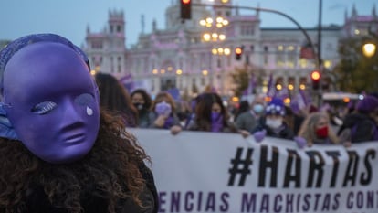Elena de León Criado, presidenta de la Federación de Asociaciones de Mujeres de la Comunidad de Madrid, encabeza la manifestación en la capital y sujeta una pancarta que reza: “Hartas de las violencias machistas contra las mujeres. ¡Soluciones ya!”, el lema de la convocatoria. Desde la federación exigen que se incluya en la ley contra la violencia de género otras formas de violencia machista que tienen lugar en otros contextos que no son la pareja, “como la violencia sexual, la vicaria y la reproductiva, y también la prostitución”, para así alinearse con el Convenio de Estambul, tal como contempla la ratificación del Pacto de Estado contra la Violencia de Género que han firmado en el Congreso este jueves todos los grupos políticos menos Vox. Las manifestantes han coreado consignas como “sin putero no hay trata” o “mi vientre, mi vagina, ni se compran ni se alquilan”. Ambas hacen referencia a la futura ley de libertad sexual, conocida popularmente como la ley del solo sí es sí, que castigará la explotación de la prostitución ajena y categorizará como violencia machista los vientres de alquiler.