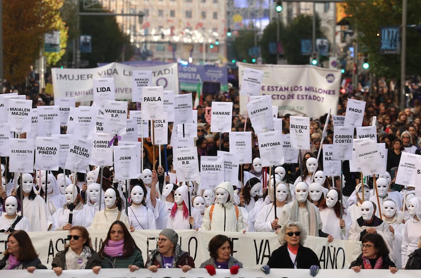 En medio de mucho negro y mucho morado, una pequeña laguna blanca ha hecho de contrapunto. Un grupo de 93 mujeres, vestidas con túnicas y caretas blancas, en silencio en medio de las consignas que sonaban —”basta ya, ni una menos”, “si te maltrata, no te quiere”— y la batucada. Eran 93 porque 93 son las mujeres asesinadas este año en España, las que se computan en todos los feminicidios, no solo los cometidos por parejas o exparejas. Eran mujeres de distintos barrios de Madrid, organizadas a través de un grupo de WhatsApp, cuenta una de ellas, Ana, de 38, que no quiere dar su apellido porque, dice, “no es importante”. “Totalmente independientes [políticamente], de múltiples edades” y que han organizado esto para “visibilizar una violencia que se sigue produciendo aún con las leyes españolas, pioneras en el mundo”. De “forma solemne”, su reivindicación ha sido “dinero para combatir la violencia, acabar con la justicia patriarcal y que no se normalice una violencia” que afecta a millones de mujeres en el mundo.