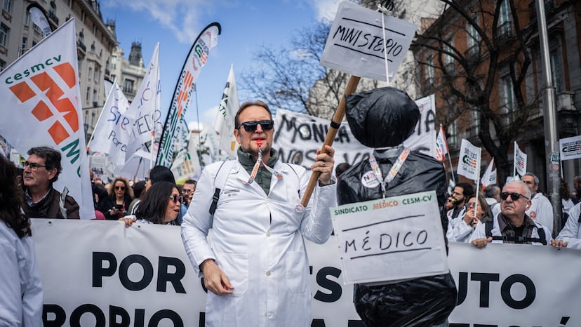 Unos 5.000 médicos de toda España se han manifestado este sábado en Madrid, según datos de la Delegación de Gobierno, en contra del borrador del Estatuto Marco del personal estatutario del Sistema Nacional de Salud que ha elaborado el Ministerio de Sanidad. Tanto sus colegios y sindicatos profesionales, como los estudiantes de Medicina, rechazan uno de los objetivos que se había propuesto la ministra Mónica García: actualizar las condiciones de trabajo de los sanitarios en un nuevo documento, el anterior tiene más de 20 años de antigüedad. Sin embargo, una marea de batas blancas se ha parado frente a su ministerio al grito de “No es vocación, es explotación”.