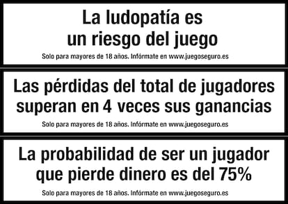 “La ludopatía es un riesgo del juego” o “La probabilidad de ser un jugador que pierde dinero es del 75%” serán algunos de los mensajes obligatorios