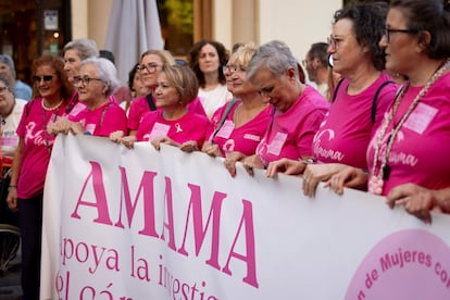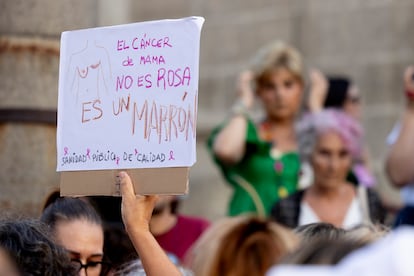 A su lado, y tapada con una mascarilla, María del Carmen Murillo permanecía más callada, pero igual de firme en su determinación por estar presente en este acto de protesta. “Vengo a apoyar a estas mujeres que están sufriendo una incertidumbre innecesaria, pero también porque se está produciendo un abandono de la sanidad”, explica. Ella ha vivido en las dos orillas: ha sido sanitaria y ahora es paciente porque padece cáncer de colon. María del Carmen vino acompañada por Dolores Gómez. A ella le duele la falta de empatía que el Gobierno ha demostrado a las mujeres con cáncer de mama, pero también la falta de atención hacia la sanidad pública: “Mi hija tiene 39 años y tiene que llevar muletas porque lleva dos años esperando a que la operen de una hernia”, se lamentaba.