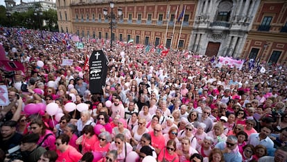 Los gritos de “Bonilla dimisión” y “Sanidad pública y de calidad” se han intercalado, casi sin interrupción, en la concentración que esta mañana han convocado las asociaciones de mujeres víctimas de cáncer de mama de Andalucía para protestar por la gestión de la crisis de los cribados y contra el deterioro y la privatización de la sanidad pública española. Mujeres y hombres de todas las provincias ―8.500 personas, según la Policía Nacional― han abarrotado la plaza del Palacio de San Telmo, sede de la Junta de Andalucía, para exigir una respuesta clara y rápida para las mujeres afectadas por los retrasos en los diagnósticos de los cribados, pero también para llamar la atención sobre la mala gestión del Gobierno de Juan Manuel Moreno Bonilla (PP) del sistema andaluz de salud que, según denuncian, ha colapsado.