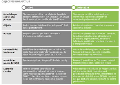 El 2035 és l’horitzó marcat per assolir un seguit d’objectius normatius que fixen les institucions comunitàries, com la reducció del 10 % en la generació total de residus respecte al 2010, la reducció del 10 % en la generació de la fracció d’envasos respecte al 2018 o l’assoliment d’una taxa de reciclatge del 65 %.
