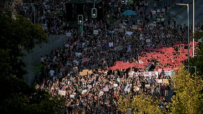 Por la tarde, miles de mujeres salieron a las calles en distintos puntos del país. En Santiago, las manifestantes se reunieron en la icónica Plaza Baquedano y se desplazaron por la principal arteria de la capital, la Alameda. Con un tono tranquilo y festivo, en la marcha se mezclaban las demandas de diferentes generaciones y colectivos feministas. A los gritos de “No es no” y “Aborto sí, aborto no, eso lo decido yo”, comunes a las luchas de las mujeres del continente, se sumaban otras reivindicaciones como quienes exigían repuestas a feminicidios o por las víctimas de las protestas políticas recientes o las que recordaban a las desaparecidas durante la dictadura. “Ahora, ahora, ahora quieren vida, cuando en dictadura mataban con la DINA” era el lema de otro de los grupos de la marcha.