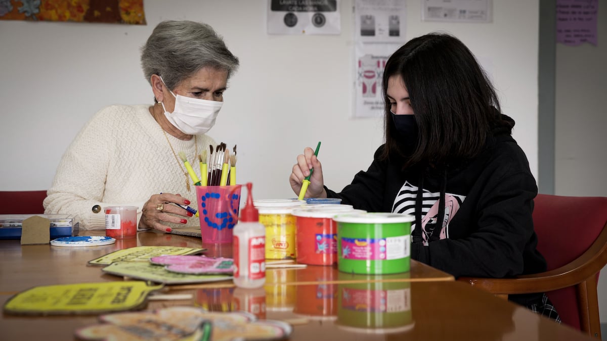 Algunos de estos talleres son intergeneracionales. Al centro se ha acercado Lara Rodríguez, estudiante de 13 años y una de las nietas que convive con Ana Luisa. Entre abuela y nieta median 67 años, pero charlan animadamente sobre qué han aprendido la una de la otra. “A mi abuela le puedo enseñar dónde va cada cosa, a qué cubo. Ellos en su época no tenían”, cuenta Lara, que sabe de reciclaje por lo que ha aprendido en el colegio, en casa y en redes sociales. “Nosotros aprovechábamos todo. Eso es algo que yo puedo enseñar”, contesta Ana Luisa.
