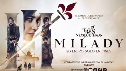 El próximo 26 de enero se estrena en cines Milady. Los tres mosqueteros, adaptación de la obra maestra del escritor Alejandro Dumas. Por ser lector de EL PAÍS, puedes verla antes que nadie asistiendo a los preestrenos, que tendrán lugar el jueves 25 de enero en los cines Cinesa Príncipe Pío de Madrid y Cinesa Diagonal de Barcelona. ¡Elige tu ciudad y participa para conseguir una entrada doble!