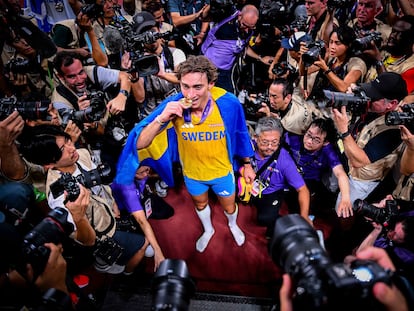 El sueco, oro en el salto con pértiga en Tokio, celebra un salto imposible para sus rivales en la final del Mundial de Atletismo