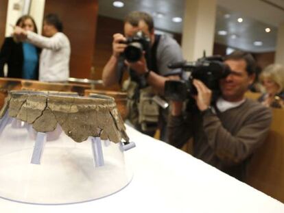 Aranzadi presenta una de las vasijas de la Edad de Bronce encontradas en el yacimiento