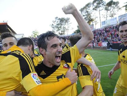 Los jugadores de Osasuna celebran el ascenso por todo lo alto y dedican el éxito a su afición, mientras los jugadores del cuadro catalán lloran su tercera oportunidad perdida