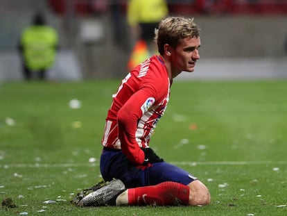 El delantero francés encuentra la protección de Simeone y de sus compañeros tras haberse encarado con la afición