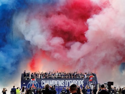 Los jugadores del PSG y su entrenador, Luis Enrique, desfilan por los Campos Elíseos, aclamados por unas 110.000 personas, antes de ser recibidos por Emmanuel Macron