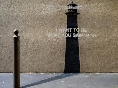 El grafiti, que sus seguidores especulan se encuentra en Marsella, muestra la sombra de un bolardo que, alargada sobre el asfalto, toma la forma de un faro