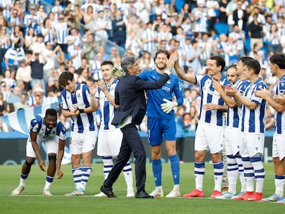 Los goles de Marín, Oyarzabal y Mariezkurrena permitieron al técnico despedirse de Anoeta tras seis temporadas y media con triunfo a pesar de la oposición del equipo de Míchel en la segunda parte