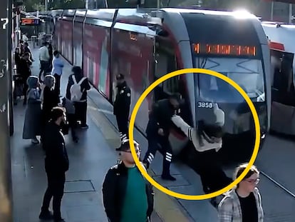 Las imágenes muestran el momento en el que la mujer, con auriculares, se dispone a cruzar las vías cuando el tranvía llega al andén