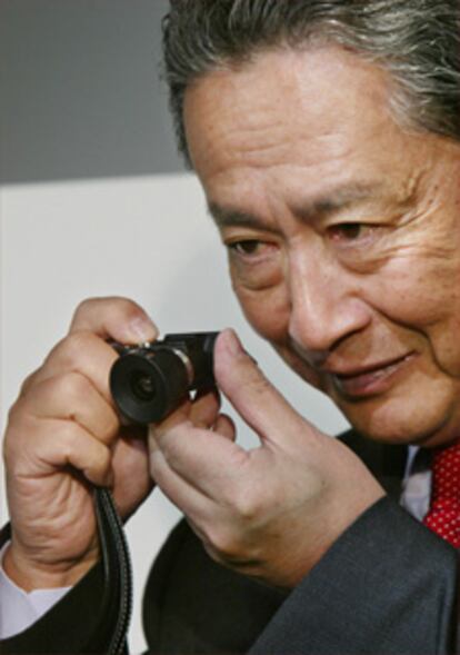 El presidente de Sony, Nobuyuki Idei, presenta el último ingenio de la multinacional. Esta pequeña cámara de fotos es capaz de tomar imágenes con dos megapíxeles de resolución. Se llama QO16-WE y está equipada con un nuevo sistema de zoom digital. Además, se le puede incorporar un gran angular, lentes de teleconversión y varias aplicaciones más. No llega a los 7 centímetros de base y tiene poco más de 2 centímetros de alto; de fondo es aún menor: 1,7 centímetros. Sale a la venta el próximo 24 de junio por algo más de 2.700 euros.