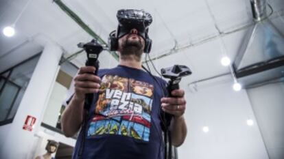 A falta de poder mover todos los dedos en el mundo virtual, buenas son unas maracas. Las que vemos arriba son del HTC de Valve, el casco de realidad virtual de los creadores de Steam. Abajo, un visor de Oculus. Y a continuación Roberto Pérez, ingeniero de Future Lighthouse, carga una experiencia en el ordenador mientras seguimos sumergidos al otro lado.