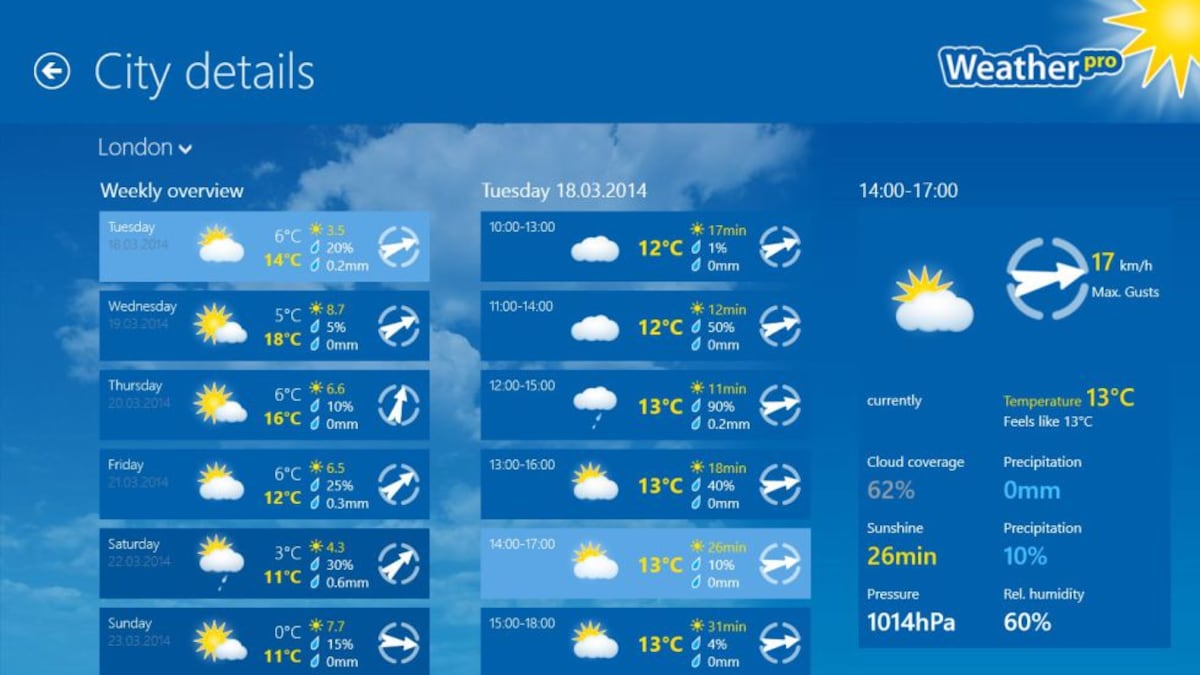WeatherPro: Se trata de la aplicación líder de meteorología en Europa en todas las plataformas y tiene sólidos argumentos para ello. Esta aplicación combina hábilmente un detalle elevado de información meteorológica con una lectura sencilla y práctica de la misma. De un vistazo, el usuario podrá saber qué tiempo hará en los próximos días, el riesgo de precipitaciones y la probabilidad de lluvia medida por horas con una elevada fiabilidad. La aplicación muestra además alertas ante cambios severos del tiempo, como fuertes lluvias, vientos o temperaturas extremas. La lectura es sencilla, pero quien quiera indagar todavía más en los detalles contará con un nivel de información elevadísimo, e incluso una animación del tiempo por tramos horarios en la que se puede ver la evolución de nubes y chubascos. Esta aplicación tiene un coste de 2,99 euros, existiendo la posibilidad de suscribirse a un servicio premium que incorpora información adicional.