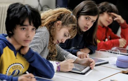 Parece una clase normal, pero ya no se trabaja con libros. Los pupitres de madera son los de siempre, aunque les faltan las marcas de los cuadernos. Sí se conservan los bolígrafos y la pizarra, pero ahora son digitales. Los niños parecen tranquilos ante el cambio: escuchan y apuntan concienzudos en sus tabletas. ¿Os ha costado dejar de usar libretas? "No, porque nos fuimos adaptando poco a poco, no de golpe, y así es más fácil", explica Mateo, de 12 años, del colegio público Isabel la Católica de Madrid. Este centro es uno de los 32 que se han integrado en el proyecto Smart School de Samsung que distribuye de forma gratuita tabletas y pizarras interactivas. Participan alrededor de 2.500 alumnos de 15 comunidades autónomas. Y esta es solo una de las iniciativas. Google ofrece un programa gratuito para colegios, Google Classroom, con el que ofrecen herramientas y contenidos digitales para gestionar las clases y potenciar la innovación. El objetivo es común: impedir que los colegios españoles se queden atrás en la revolución que la tecnología e Internet está llevando a las aulas.