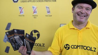 Comtoolz negocia actualmente su implantación en Reino Unido con Vodafone. “Aunque los usuarios pueden llevar a cabo el proceso en casa siguiendo las instrucciones, lo ideal sería que en las tiendas estuviese uno de nuestros empleados disponible para proteger los teléfonos que se adquieran”, añade Scoular. De momento, el precio en dólares de su solución es de 14,99 para relojes inteligentes, 19,99 para móviles, y 29,99 para tabletas. “Y garantizamos su valía durante cinco años”, remata ante un nutrido número de curiosos que se rasca la cabeza incrédulo. Para convencerlos, la empresa tiene preparados los resultados de laboratorios independientes que certifican el hallazgo de sus científicos. Este periodista lo ha probado, y al cabo de dos días es evidente que se fijan menos huellas. Pero con el martillo preferimos no golpearlo.