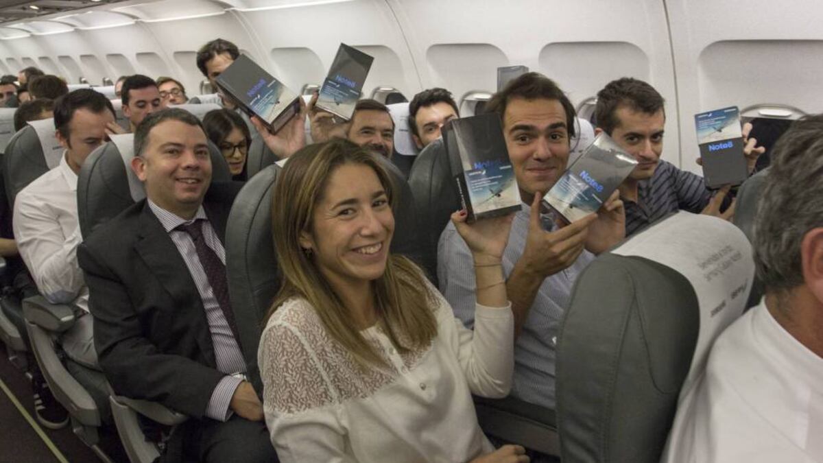 Los pasajeros que subieron esta mañana al avión de Iberia empezaron a sospechar de que iban a ser objeto de una acción publicitaria ya que el aparato estaba adornado con mensajes de la marca y de la campaña “Bienvenido a bordo Galaxy Note 8", que el fabricante coreano y la aerolínea han puesto en marcha desde hace unas semanas. Ya en vuelo, el comandante se dirigió a todos los pasajeros para confirmarles que eran los protagonistas de una acción muy especial. Celestino García, vicepresidente corporativo de Samsung España, que viajaba en el avión, les hizo entrega del móvil.