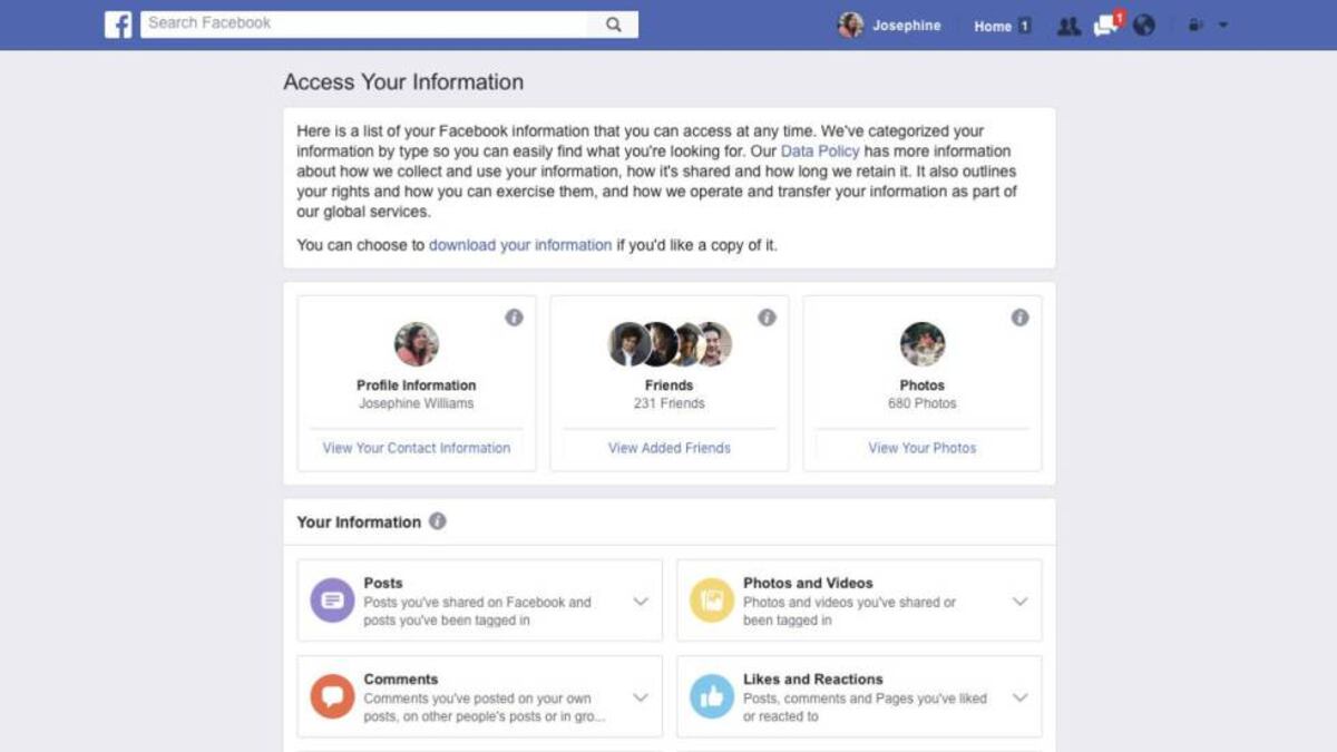 Facebook también ha anunciado una herramienta para buscar, descargar y eliminar los datos personales que maneja la compañía. Mediante la pestaña "Acceso a tu información", los usuarios pueden gestionar su información, publicaciones, reacciones o comentarios. “Puedes entrar allí para borrar cualquier cosa de tu biografía o perfil que ya no quieras que esté en Facebook”, afirma el comunicado.