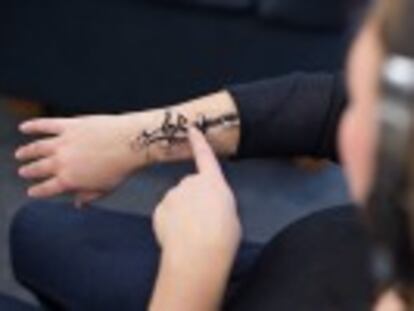 Una voz alegre y cantarina suena a través del teléfono móvil de Ana Tejero. Es su madre, de 80 años, entonando Madrecita del alma querida, la canción que horas después Ana y su hermana Virginia tendrán grabada en la piel para siempre. "Nos vamos a hacer un tatuaje sonoro de nuestra madre cantando", explica Ana emocionada. Esta maña de 38 años ha acudido con su hermana, de 50, al estudio El Salado (Madrid) para trazar en sus brazos un vínculo de tinta de lo más tecnológico. Se trata de una forma de onda grabada en la piel que puede ser leída y reproducida por una aplicación de móvil —como si fuera un código QR—.