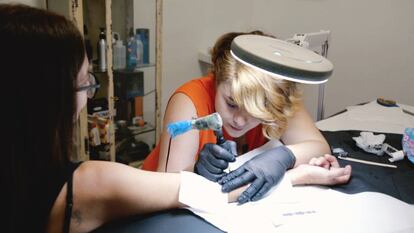 "Un tatuaje sonoro es un dibujo en el que puedes almacenar un recuerdo auditivo y visual. Esa voz la podrías llevar en el teléfono igual, no hace falta que te la grabes en la piel. Pero así la persona siente que la lleva encima", explica la tatuadora Cristina De Miguel mientras sujeta el brazo de Ana y lo coloca con cuidado debajo del haz de luz blanca de un flexo. Con unos guantes de silicona negros comienza a introducir el cartucho en un pequeño bote de tinta.