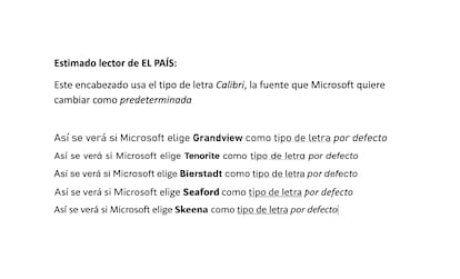 Cada vez que escribe un correo en el programa Outlook o abre un documento de Microsoft Office (ya sea Word, Excel, PowerPoint, entre otros), como hacen millones de personas cada día, el programa usa por defecto (o de forma predeterminada, es decir, automáticamente si no se elige otra) un tipo de letra llamado Calibri. Es así desde 2007, año en el que reemplazó a la legendaria y añeja Times News Roman. Pero a la Calibri le queda poco de reinado. La empresa estadounidense va a decidir la nueva opción por defecto entre cinco candidatas. “Querida Calibri”, asegura la propia compañía en su anuncio. “Nos ha encantado el tiempo que hemos pasado juntos, pero hemos superado esta relación”.