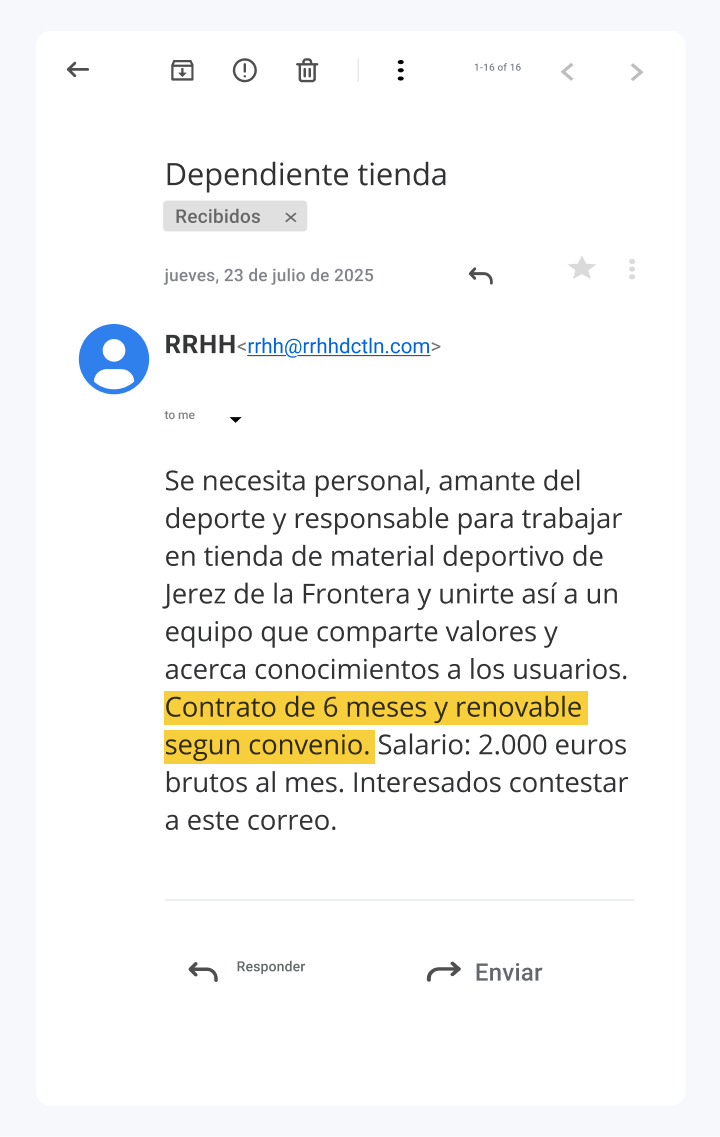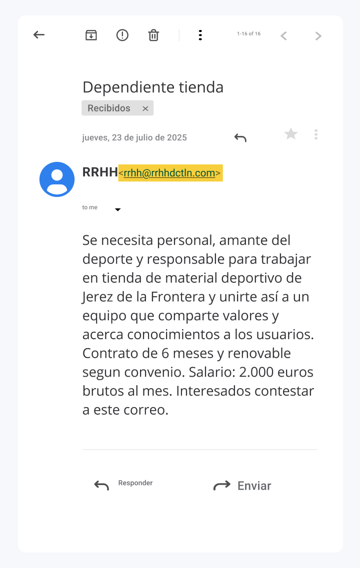 Dos vecinos de Jerez de la Frontera (Cádiz) recibieron a finales de 2024 un correo electrónico con una oferta para trabajar en una tienda de una conocida cadena de material deportivo en la misma ciudad andaluza. Ambos respondieron a la propuesta y el estafador, que se hacía pasar por el departamento de recursos humanos de la cadena, solicitó previamente el pago por internet de diversas cantidades de dinero en concepto de gestiones administrativas. El dinero se les devolvería al ser contratados. Los vecinos enviaron 1.580 euros. Los trámites nunca se realizaron, según reportó la Policía Nacional y recogieron los medios de comunicación.