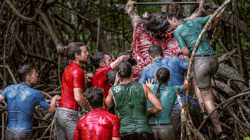 Tres equipos de ocho personas se arrastran boca arriba atados de pies y manos. Reptan como gusanos buscando la salida de un laberinto muy embarrado. Gritos y tacos, muchos tacos, se mezclan con el ingenio y la resistencia en un auténtico lodazal en el que unos pasan sin miramientos por encima de los que van más lentos. Hay que ganar para comer. Una ciénaga plagada de mosquitos y bichos diversos espera a quienes pierdan en la...