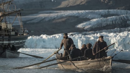 Y, por supuesto, está el Ártico. “Encontramos un montón de dificultades en el rodaje. Al principio estuvimos dos días sin poder grabar porque no encontrábamos hielo flotante”, ríe ahora. “Luego no podíamos abandonar el barco porque el clima podía cambiar en un minuto… Tienes que aprender a trabajar instintivamente. Podrías usar todo tu intelecto para intentar que funcione, pero al final tienes que dejarte llevar por tu instinto. Para mí fue aterrador, pero también muy emocionante”. Un rodaje así, para el que tuvieron que contar con un equipo de expertos en el terreno, que participaron en la serie como extras, y con vigilantes armados por si aparecían osos polares, supuso retos logísticos, físicos y también emocionales. Un barco rompehielos ayudaba a trasladar la réplica del ballenero y la nave en la que dormía el equipo. Actores y técnicos iban provistos de unos trajes especiales para no morir congelados si caían por accidente al agua. “Notas el miedo, sabes que estás muy lejos de cualquier ayuda médica, que si algo va mal, estás en problemas… Fue una experiencia increíble, pero creo que no lo haría otra vez”, reflexiona Haigh.