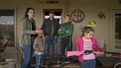 El primer testimonio del primer capítulo ya es perturbador. Nos presenta a una española que se instaló en Texas por su apego a los valores conservadores: Dios, familia, patria... y armas. Ella y su marido tienen un arsenal en su rancho, que incluye armas automáticas que serían muy apreciadas en Bajmut. La mujer instruye a sus dos hijas pequeñas en su manejo. Una de las niñas practica con un rifle de color rosa. Un aluvión de testimonios de masacres cometidas por chiflados armados, contra niños o contra cualquiera que se les ponga delante, pone el contrapunto. Una profesora de colegio llora al contar que enseña a los alumnos desde pequeños cómo esconderse de un tiroteo.