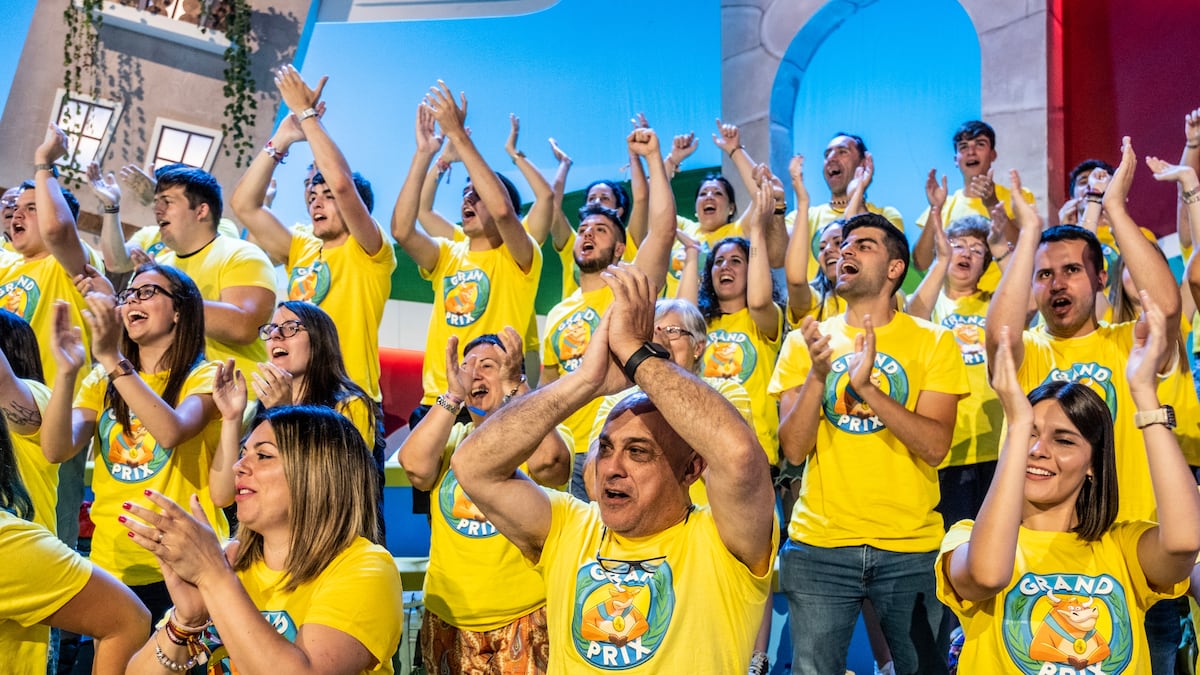 La siguiente prueba es La guardería. Van empatados. Mientras los concursantes se colocan en posición, alguien grita desde la grada de Tineo: “¡Venga Estela que está en tus manos!”. Estela está demasiado concentrada dentro de su disfraz de bebé gigante como para preocuparse de esta presión. Los concursantes se refieren a sus rivales como “los del otro bando” y resulta agradable escuchar esa expresión, tan corrompida durante los últimos meses de campañas electorales, en un contexto tan inofensivo. “Es perfecto que se estrene justo el día después de las elecciones”, opina Ramón García. “Seremos un remanso de paz después de tanto ruido: dos horas y media de tranquilidad viendo el Grand Prix con una cervecita”.