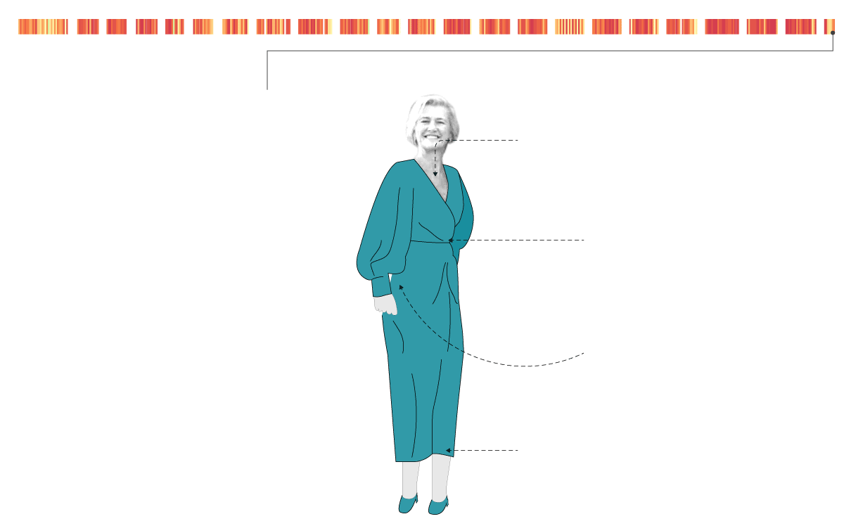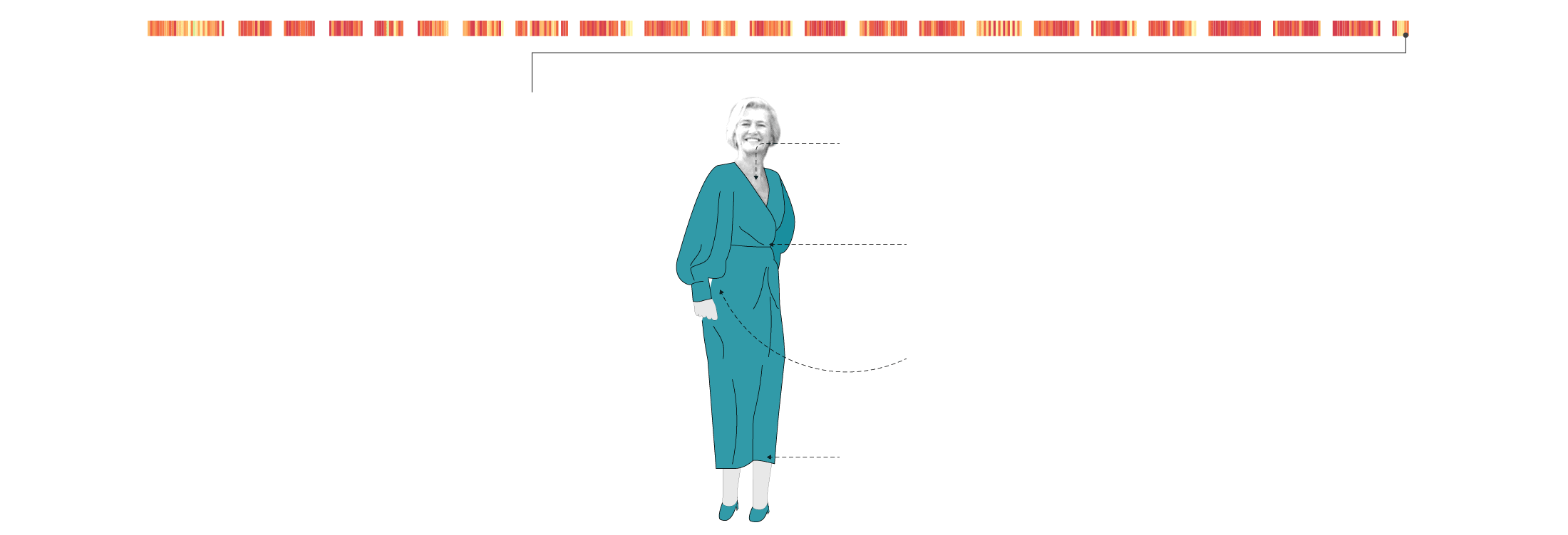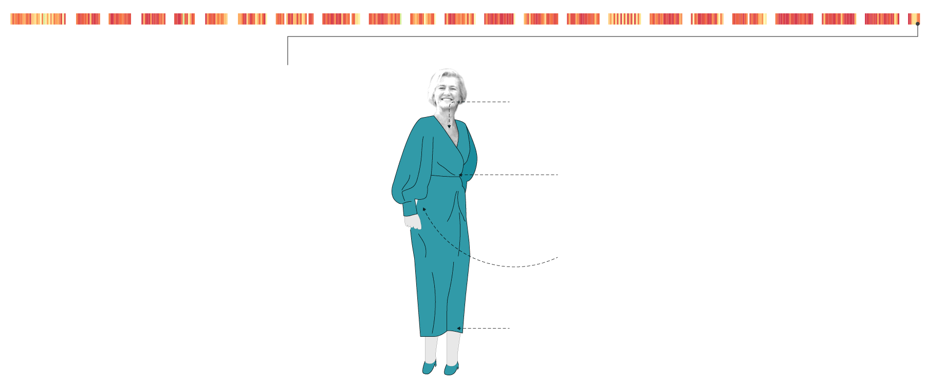 Cada línea del siguiente gráfico representa uno de los 30 personajes más nombrados en la serie. El color indica el número de menciones: cómo de importante es cada uno en cada capítulo.