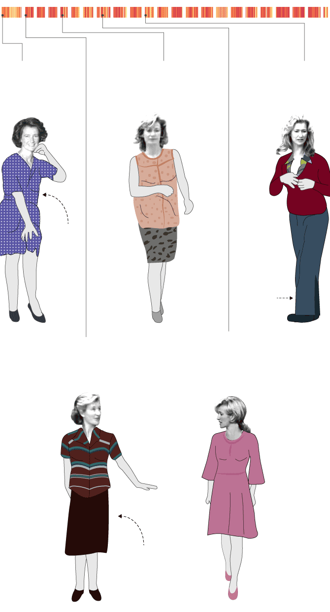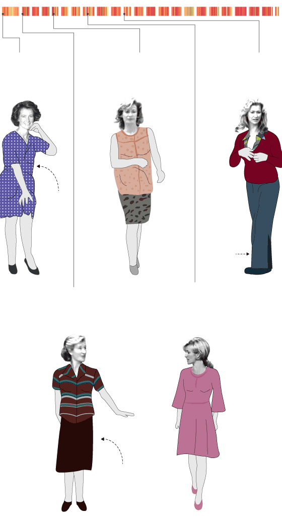 En los años ochenta, Mercedes atraviesa una época de cambios. Y su vestuario con ella. Las camisas anchas empiezan a ser una constante después de superar un cáncer de pecho; los vestidos y las faldas continúan siendo estrechos, pero a la vez su largo crece, hasta tapar las rodillas.