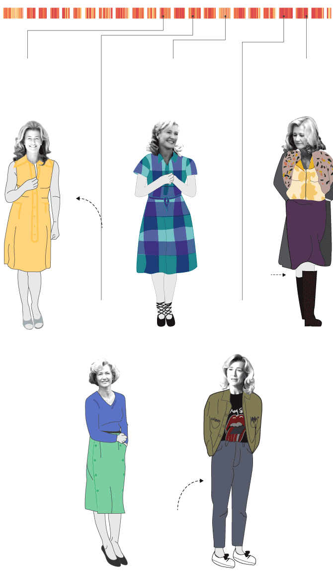 Merche comienza su periplo por la serie como una mujer de pueblo recién llegada a la capital y acaba siendo una prestigiosa diseñadora de moda. La Merche de los sesenta vestía delantales, vestidos estampados y faldas por debajo de la rodilla. A medida que el personaje evoluciona (abre su propio negocio, va a la universidad, aprende a conducir…) lo hace también su forma de vestir. En su armario aparecen pantalones algo acampanados, vestidos entallados que realzan la figura o prendas con estampados alegres o colores intensos.