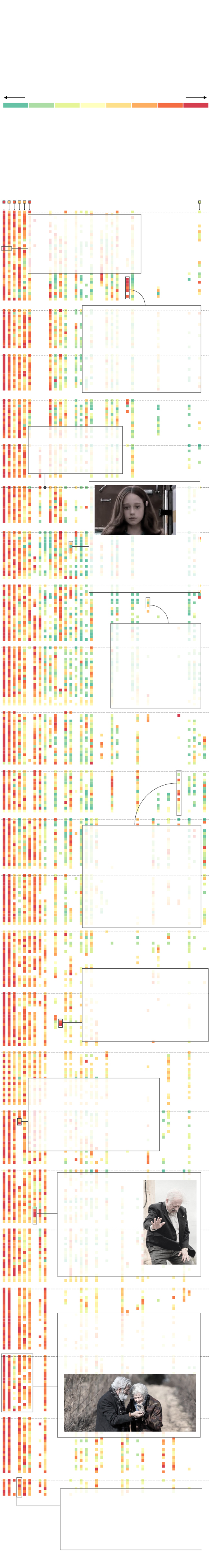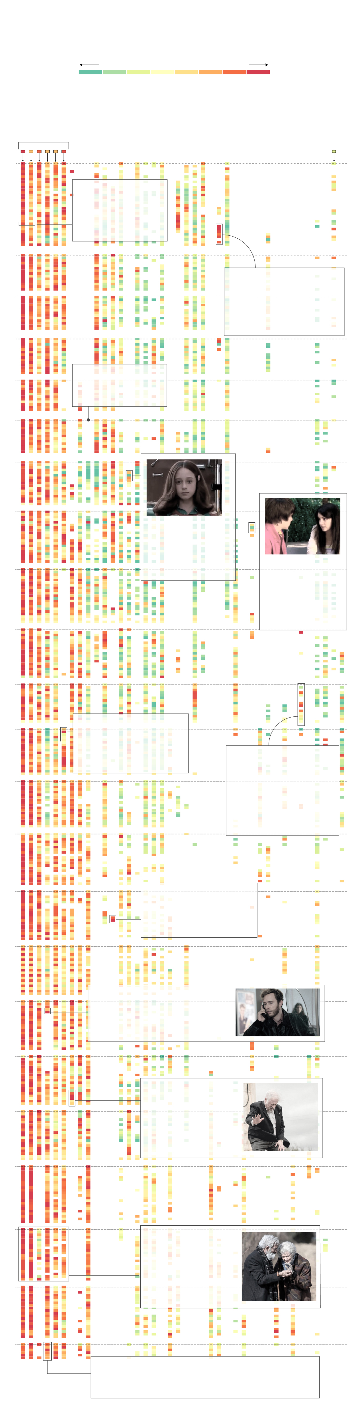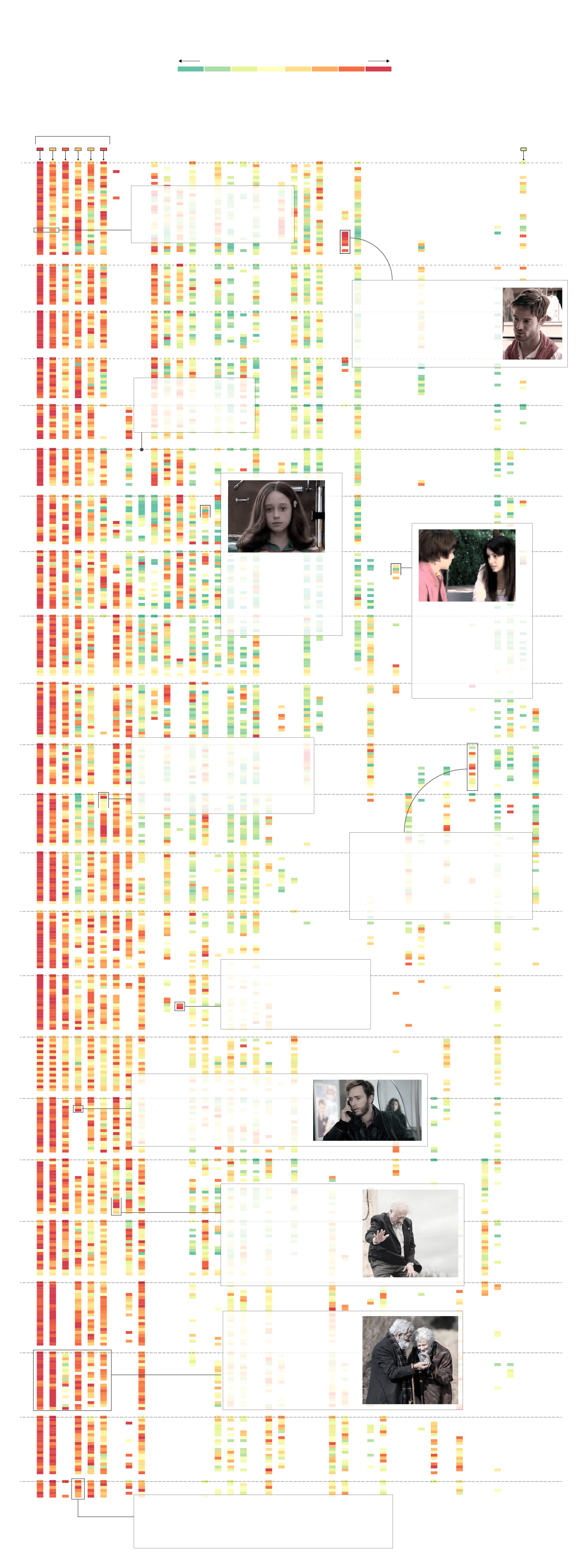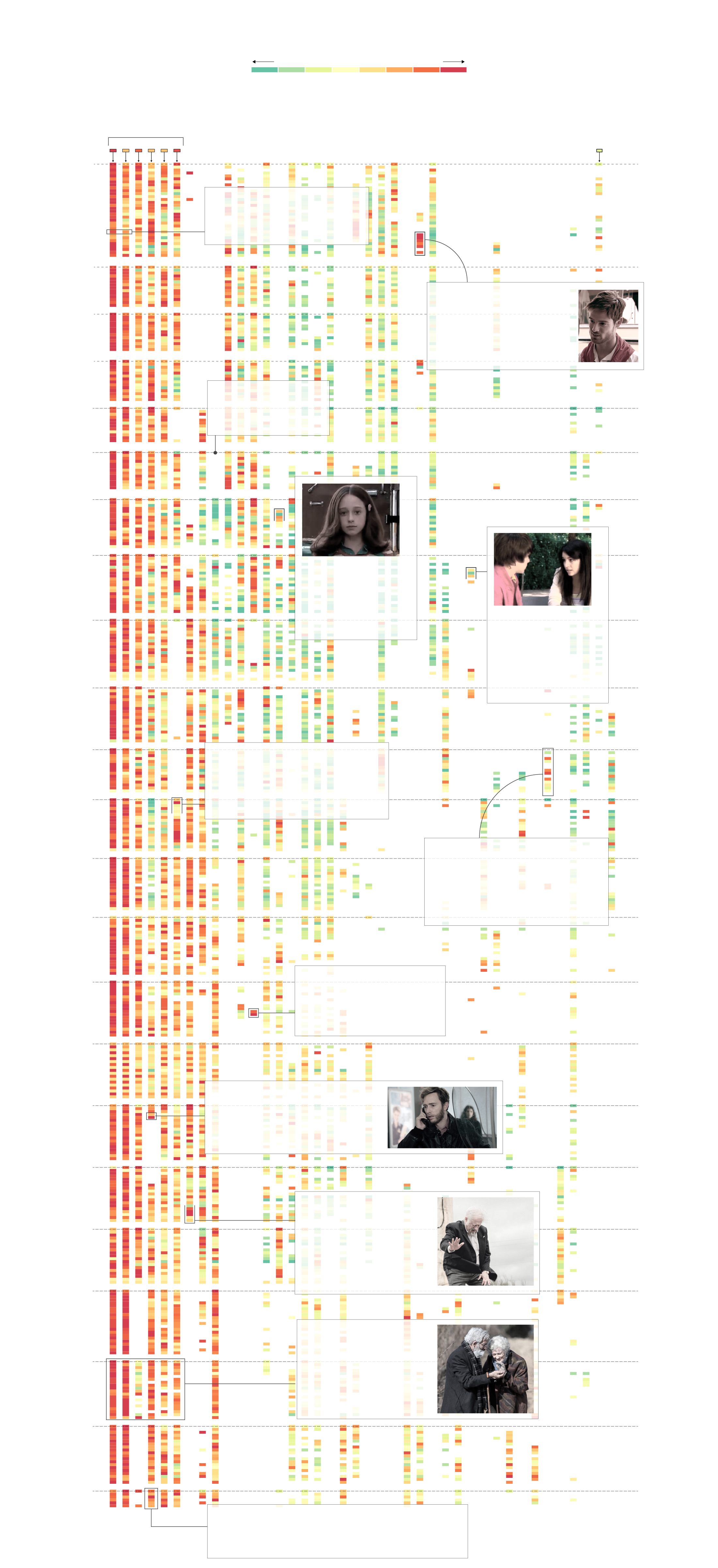 El color indica el número de menciones: cómo de importante es cada uno en cada capítulo.