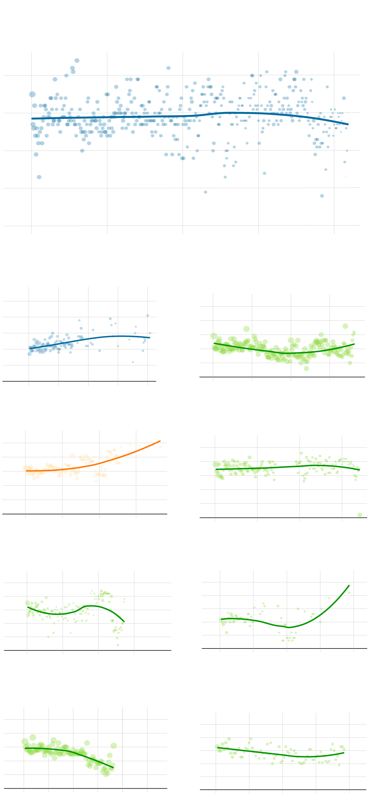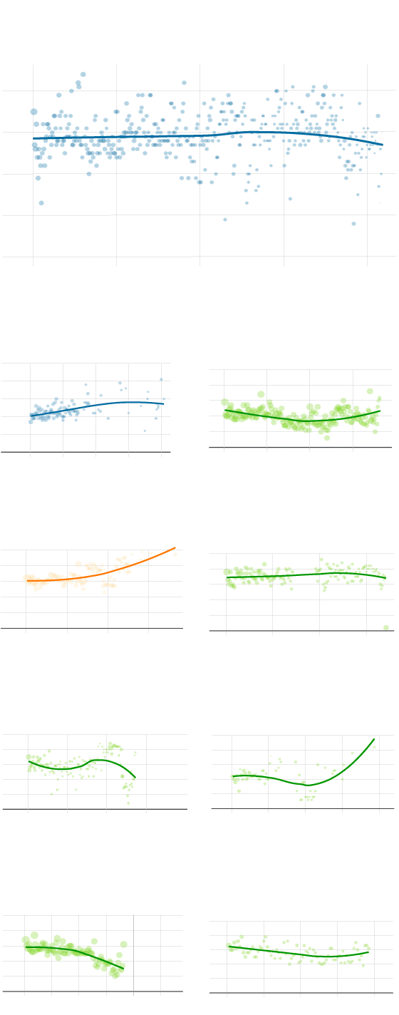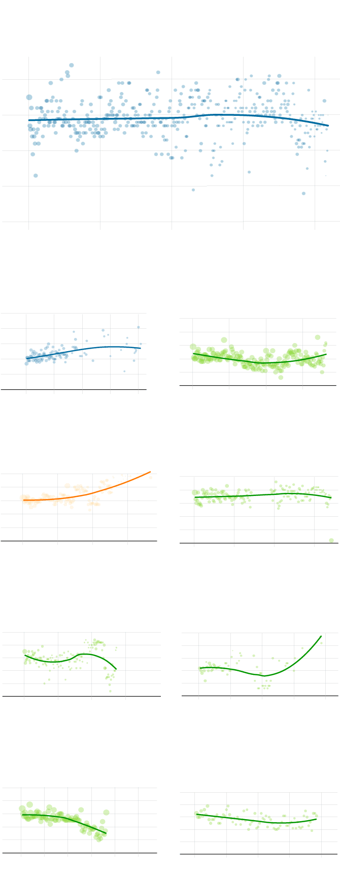 Cuéntame es extraordinaria también por la estabilidad de sus valoraciones. En el siguiente gráfico se ven otras series españolas largas. En algunas como Los Serrano, Los Hombres de Paco o Aquí no hay quien viva, las puntuaciones caen gradualmente o acaban cayendo con últimas temporadas desastrosas. Otras, como 7 vidas y Águila Roja, parecen mejorar hacia el final, pero se aprecia que los ve y valora mucha menos gente.