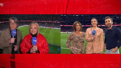 Esteban, cuya afición al equipo rojiblanco es conocida, aprovechó su momento en las gradas para dar su opinión del partido: “No me está gustando el árbitro, lo siento, y estoy sufriendo”. Su equipo perdió el encuentro. Patiño, por su parte, aseguraba que este era su primer partido en vivo: “Le hemos estado explicando todo, lo que era el VAR, quién es Lamine Yamal, los penaltis...”, decía Hernand, también del Atlético. “En La familia de la tele va a caber todo el mundo. No solo vamos a tener tarjetas rojas y amarillas, sino de todos los colores”, anticipó Albizua. “El mejor estreno está por venir. Esta afición es la que queremos en nuestro nuevo programa: gente apasionada, volcada y competitiva”, sumó Patiño sobre el programa que se estrena este abril. TVE aprovechó el descanso del partido para promocionar el resto de su reconfiguración: el nuevo espacio de humor de Andreu Buenafuente, Futuro imperfecto (”El mundo no va muy bien, pero habrá que reírse de ello”, dijo el presentador desde su teatro) y Malas lenguas, en La 2, que presentará Jesús Cintora, también presente en el estadio.