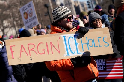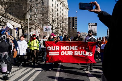 Muchas de las pancartas reivindicaban la libertad: Free DC (Distrito de Columbia libre) y Free America, se leía en decenas de ellas. La mayoría, sin embargo, hacía referencia a la ofensiva antiinmigración del Gobierno y a su brazo ejecutor: el Servicio de Inmigración y Control de Aduanas (ICE, por las siglas en inglés). Justo hace un año Trump inauguró su mandato con un aluvión de órdenes ejecutivas orientadas a lo que ha sido una prioridad de su Gobierno: lograr la mayor deportación de la historia. En aras de conseguirla, el republicano ha eliminado programas humanitarios que permitían la residencia temporal de millones de migrantes, cancelado el programa de refugiados, reducido al máximo el asilo, endurecido la concesión de visados y cerrado la frontera.
