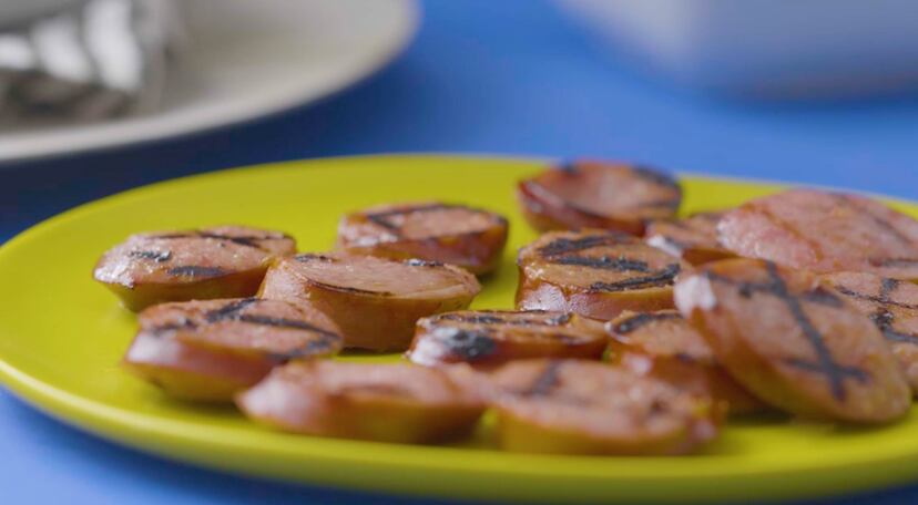 Asa las salchichas hasta que estén casi cocidas. Aumenta el fuego a alto y vuelve a colocar las salchichas en la parrilla, con la parte redondeada hacia abajo, rotándolas hasta que queden bien marcadas por ambos lados.