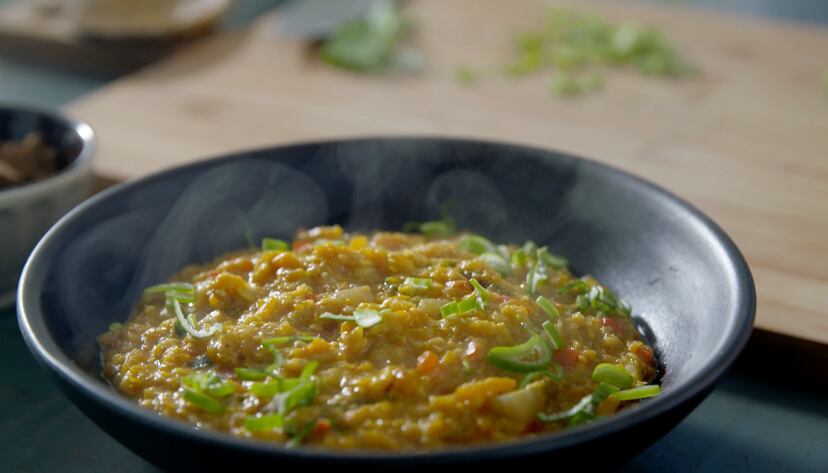 Sirve en una hoja de maíz o plato de barro con un trozo de queso debajo espolvoreado con azúcar moreno, adorna con cebolla de verdeo.