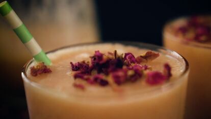 Pon los melocotones y los pétalos de rosa en una licuadora, añade dos tazas de agua fría y procesa hasta obtener una mezcla homogénea.