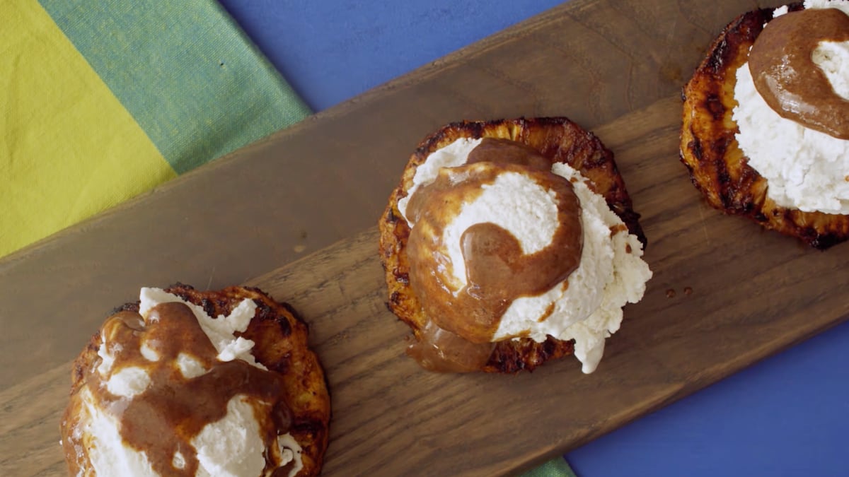 Transformar la piña en un postre diferente y original es fácil con esta receta. La piña fresca, cortada en aros y marinada en una mezcla de ron oscuro, azúcar de palma de coco, y especias como canela y jengibre, puede convertirse en todo un manjar. Servida con helado de vainilla y un glaseado de ron, esta opción a la parrilla es el cierre perfecto para cualquier comida al aire libre.